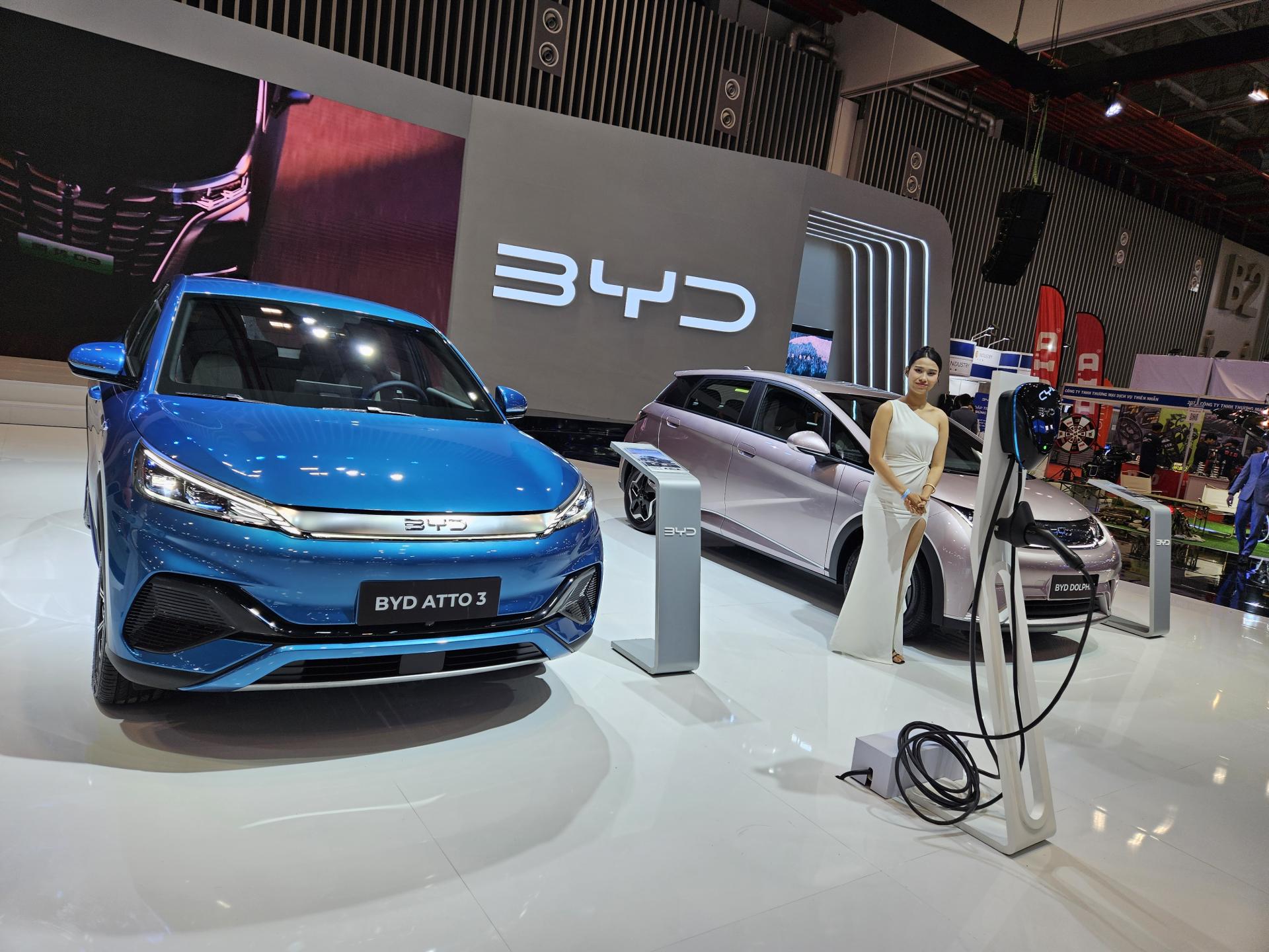 Ba mẫu xe đánh dấu bước đi đầu tiên của BYD tại thị trường Việt Nam là BYD DOLPHIN, BYD SEAL và BYD ATTO 3 cũng góp mặt tại triển lãm năm nay. Các mẫu xe này đều sở hữu những đặc điểm nổi bật riêng như sự tiện lợi trong đô thị với thiết kế nhỏ gọn của BYD DOLPHIN, kết hợp giữa khả năng vận hành bền bỉ và thiết kế hiện đại của BYD ATTO 3 hay gây ấn tượng với hiệu suất mạnh mẽ và công nghệ an toàn tiên tiến của BYD SEAL.
