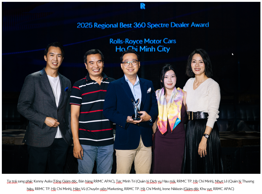 Tại đây, Rolls‑Royce Motor Cars TP. Hồ Chí Minh vinh dự được trao giải thưởng “2025 Regional Best 360 Spectre Dealer Award” (Xuất sắc nhất về Triển khai Toàn diện mẫu xe Spectre). Rolls-Royce Motor Cars Thành phố Hồ Chí Minh đã vinh dự nhận Giải thưởng Đại lý Specter 360 Xuất sắc Khu vực năm 2025 nhờ thành tích tiếp thị và bán hàng vượt trội của Spectre, mẫu siêu xe coupe điện hạng sang đầu tiên của thương hiệu. Đội ngũ đã xuất sắc định vị Spectre như một "mẫu xe kinh điển của tương lai", quản lý mọi điểm tiếp xúc trong hành trình của khách hàng—từ hướng dẫn kỹ thuật đến đặt hàng theo yêu cầu—đánh dấu sự chuyển đổi thành công sang chương tiếp theo mang tính định hình kỷ nguyên cho thương hiệu.